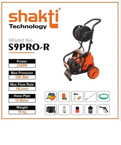 - Packaging Details: The **Shakti S9 Pro-R High Pressure Washer** is a premium cleaning tool designed for versatile applications in residential and commercial settings. Below are its key features and specifications: ### Key Features: 1. **High Pressure and Efficiency:** – Maximum pressure of 150 bars, suitable for removing tough dirt and grime. – Water flow rate of 10 liters per minute for consistent cleaning performance. 2. **Powerful Motor:** – Equipped with a durable 2300W copper-wound motor, ensuring longevity and reliable operation. – Supports heavy-duty cleaning tasks such as car washing, floor cleaning, and outdoor maintenance. 3. **Convenience and Mobility:** – Comes with a 15-meter long hose, offering extended reach and flexibility. – Compact and sturdy design with an ergonomic handle for easy transport. 4. **Advanced Technology:** – Features auto-stop technology to save energy by switching off the motor when not in use. – Includes a digital display for monitoring settings and operations. 5. **Accessories Included:** – Foam cannon, inlet pipe, outlet hose, quick connectors, microfiber wash mitt, and pressure gun. ### Applications: – Suitable for car washing, solar panel cleaning, garden maintenance, and industrial uses. ### Pricing: The S9 Pro-R is priced around ₹9,000–₹11,000 depending on the seller and any included accessories. Let me know if you’d like further details or assistance!